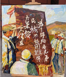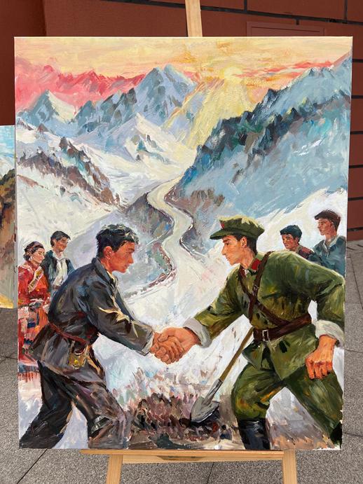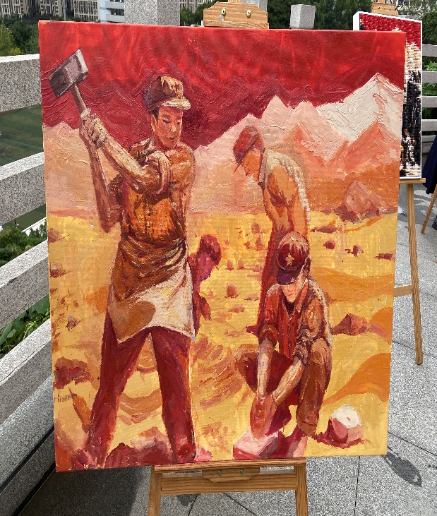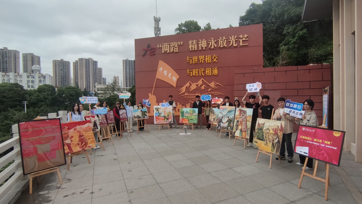 随后,师生们移步室外观看艺术设计学院学生“两路”故事绘作品展。一幅幅色彩饱满、构思巧妙的画作,展现了同学们对“两路”精神的深刻理解与艺术化表达,体现出青年一代对光荣传统的敬意与创新传承。