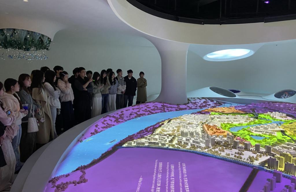在麓悦江城,师生们首先参观了城市展示厅与麓溪湖规划馆,场馆以“自然—宇宙”双主题叙事,通过曲折迂回的混凝土墙体与光影装置构建沉浸式体验空间,其迷宫式流线设计强化了交通空间的叙事性与探索感。原滩公园则直面68米竖向高差挑战,通过临崖栈道串联湿地公园与山地公园,形成“高架桥下动区—密林静区”的立体交通网络。栈道上方为车行高架桥,下方为静谧湿地景观,空间叠合创造独特场域效应。