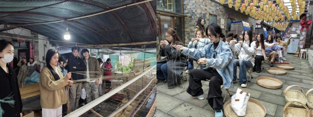 再次走进壹秋堂夏布坊,同学们进一步了解了夏布产品的多样化应用。工作人员系统讲解了不同质感布料的使用场景,并指导学生亲身体验绩纱、挽芋子、穿扣、织布等核心工艺环节。通过持续的动手实践,学生们对传统织造技艺有了更深的领悟。值得一提的是,前期课程中学生设计的夏布文创产品已在壹秋堂实体店正式售卖,市场反响热烈,部分作品更出现供不应求的情况,充分证明了传统工艺与现代设计融合的商业价值与市场潜力。