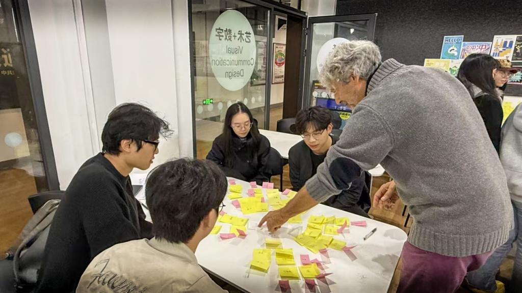 工作坊的下午环节以训练为主。学生以小组形式开展团队讨论,从问题界定、热身互动、情绪准备,到基于个人潜意识的创意探索,逐步完成亲和图的构建,并借助该工具拓展思维、推进创意生成过程。