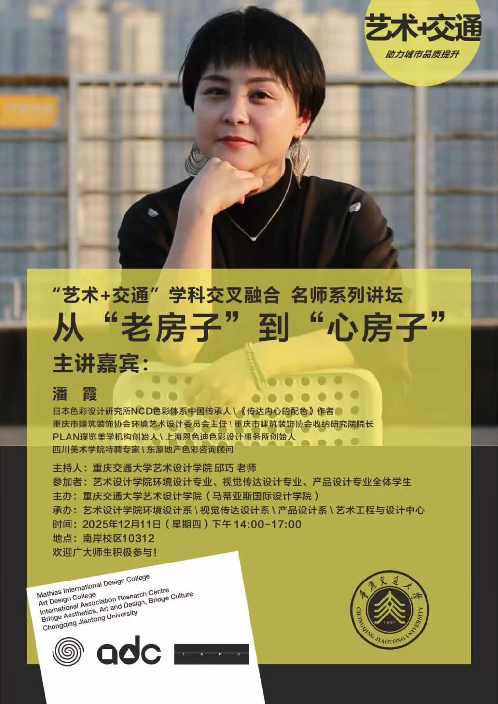 2025年12月11日,重庆交通大学艺术设计学院主办的绿色设计前沿微课——《从“老房子”到“心房子”》在南岸校区10312顺利进行。本次讲座嘉宾潘霞老师是日本色彩设计研究所NCD色彩体系中国传承人、《传达内心的配色》作者、PLAN璞览美学机构创始人、上海恩色迪色彩设计事务所创始人。作为业内知名专家,潘霞老师还担任了重庆市建筑装饰协会艺术设计委员会主任、重庆市建筑协会收纳研究所所长等职务。艺术设计学院环境设计系邱巧副教授主持讲座,2023级环境设计、产品设计、视觉传达设计学生到场参加。