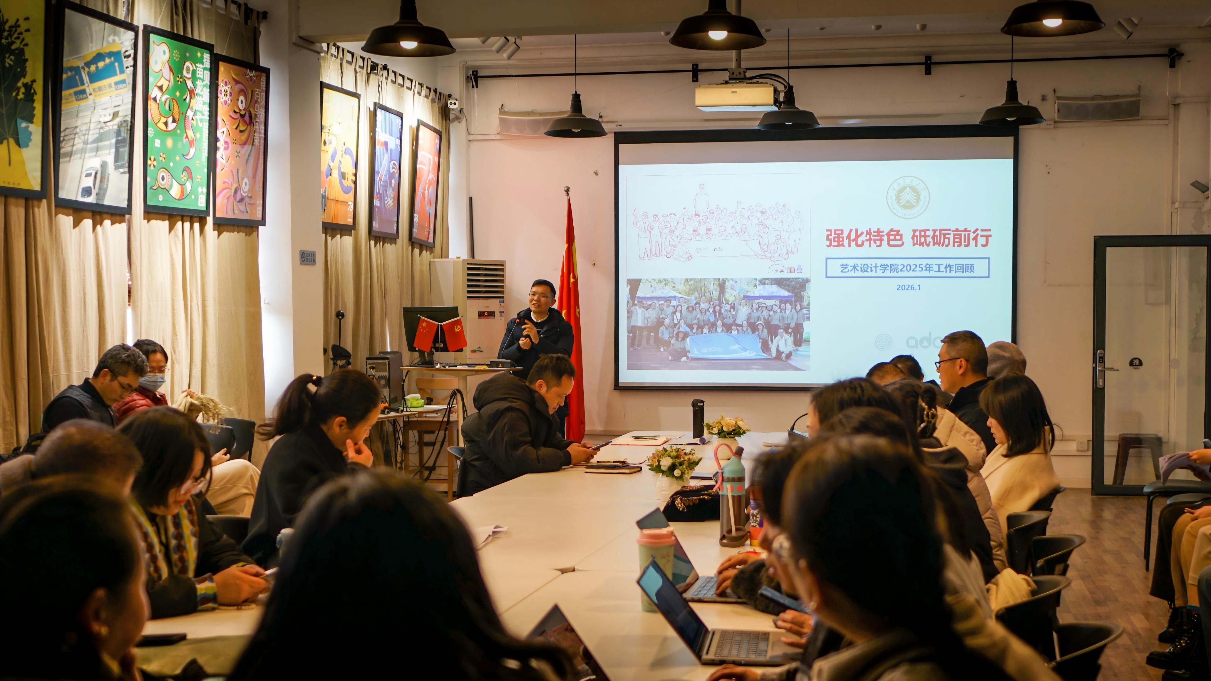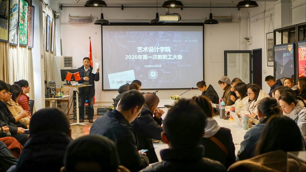 2026年1月14日下午,艺术设计学院2026年第一次教职工大会在南岸校区第一教学楼10312众创空间召开。学院全体教职工参会,会议由李伟湛院长主持。