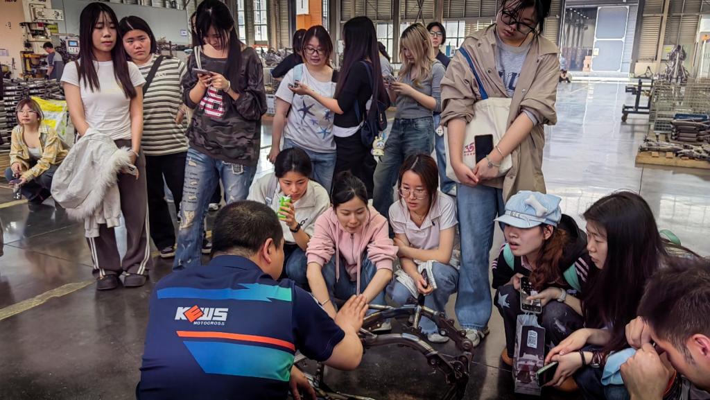 师生到达企业后,在公司赵紫烟董事长、林茂骏董事、李志红总经理,以及研发设计、技术、生产等部门负责人与技术骨干的陪同讲解下,师生一行依次参观企业展厅、研发测试区、模型制作车间、总装厂房及车架生产车间,全面了解越野摩托车从设计、研发、制造到装配的全流程。