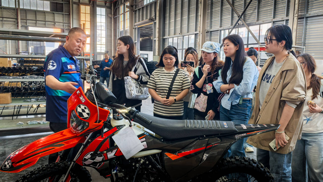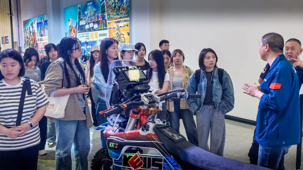 在企业展厅,讲解员围绕摩托车结构、应用场景、产品分类、市场发展态势及核心零部件进行系统介绍,让同学们直观了解机车产品的设计逻辑与市场定位。